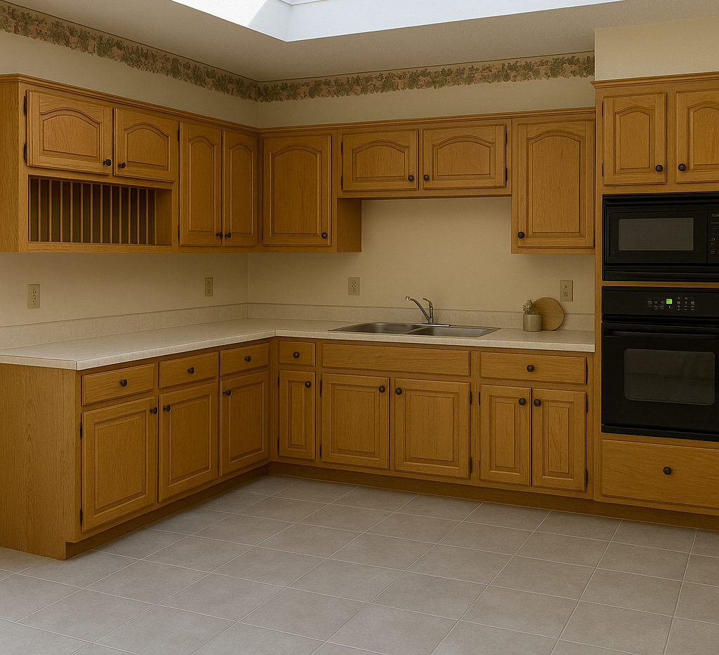 We removed the old oak cabinetry, fluorescent lighting, and laminate finishes, opening the room to natural light from the existing skylight. Classic shaker-style cabinets in warm ivory were paired with a deep green island, brass hardware, and porcelain flooring to achieve a refined yet welcoming look - built to last through years of family meals and memories. The new layout includes double wall ovens, quartz countertops, and custom shelving—creating a kitchen that’s as beautiful as it is family-friendly.